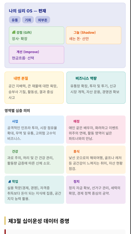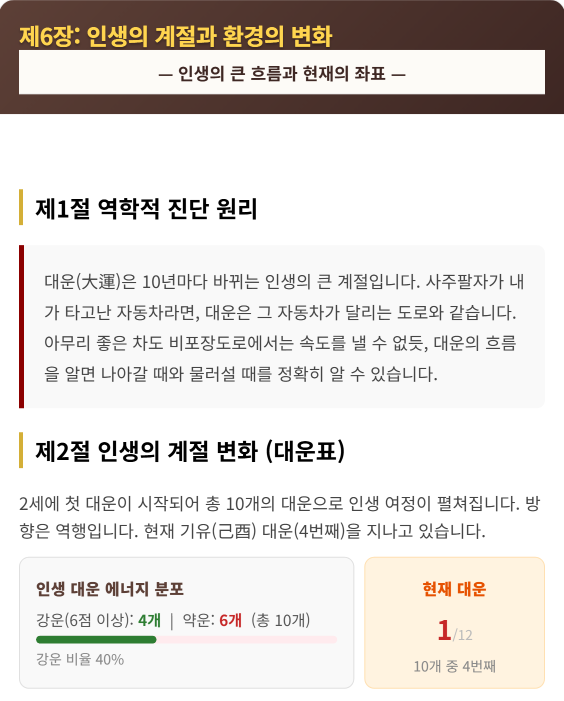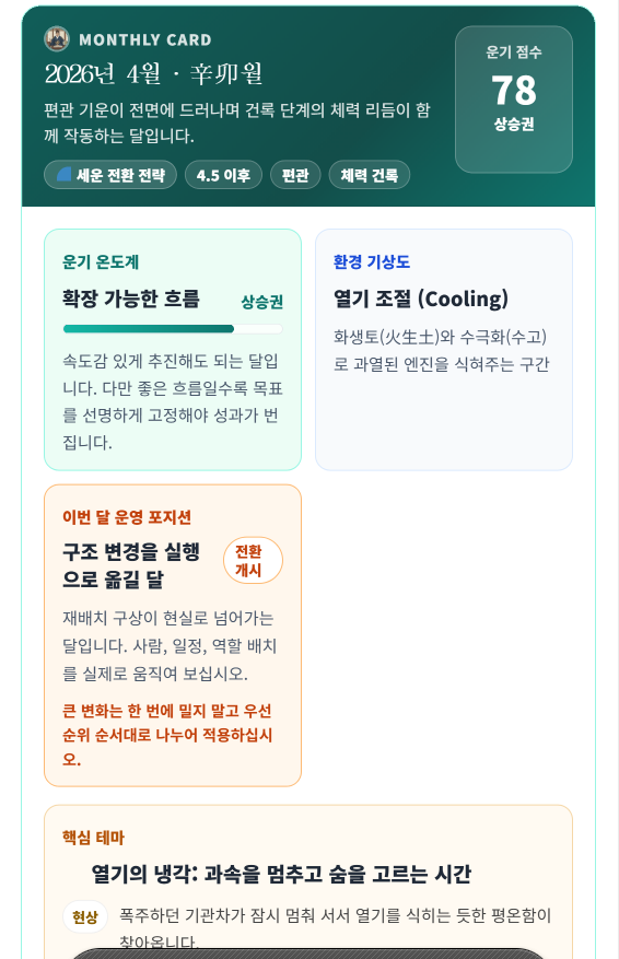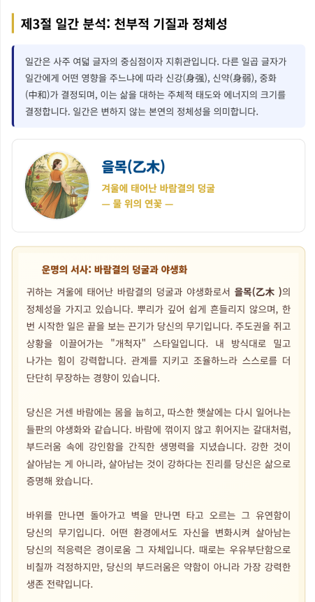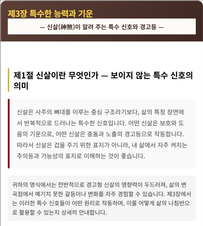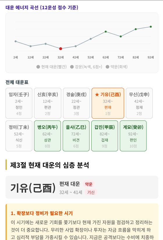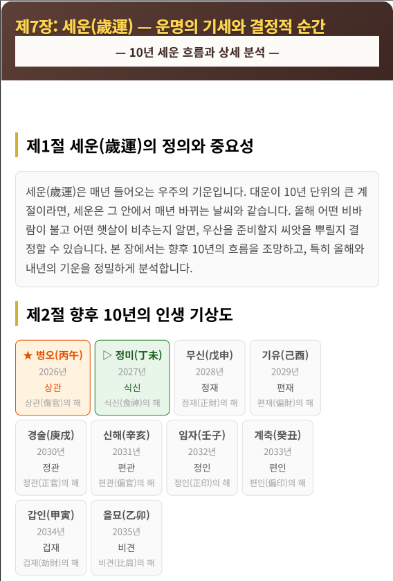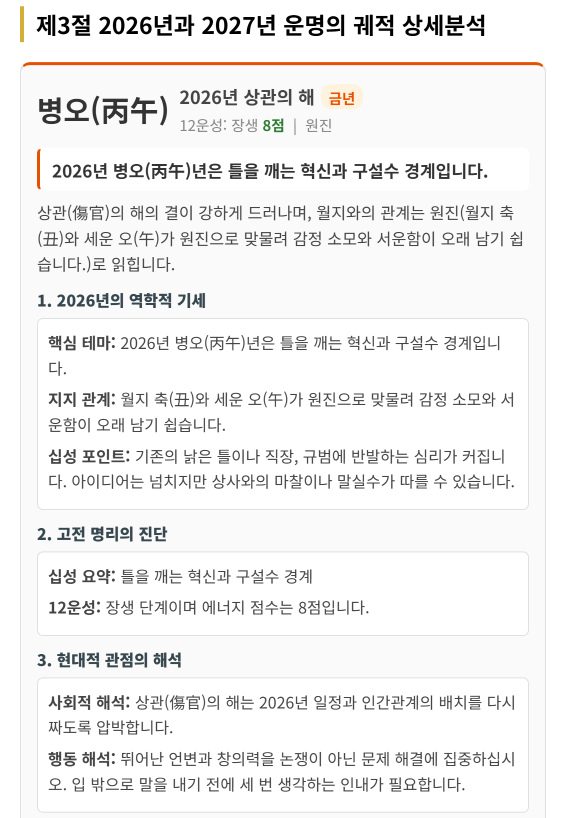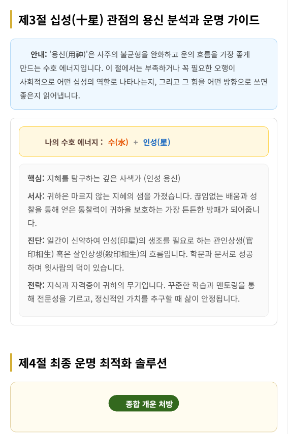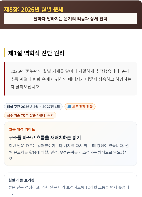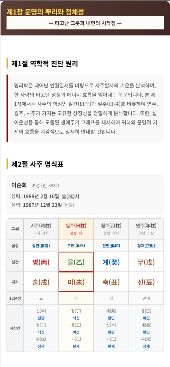 인터넷에 떠도는 뻔한 ‘올해의 운세’로는 이 폭발적인 기운에 대비할 수 없습니다. 저희 서비스는 단순히 글자만 나열하는 과거의 방식에서 벗어나, 완벽히 시각화된 8장 분량의 **’운명 최적화 리포트’**를 통해 여러분의 한 해를 완벽하게 가이드해 드립니다.
