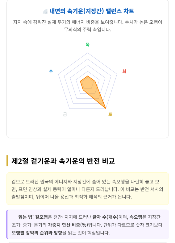 단 1분의 오차도 허용하지 않는 출생지 경도(진태양시) 보정부터, 내 사주의 과다와 결핍을 한눈에 보여주는 오행 에너지 시각화까지!