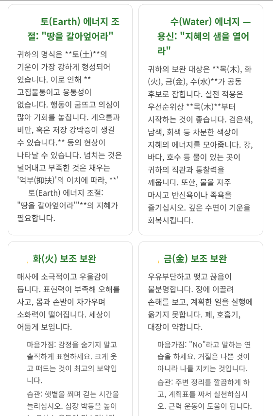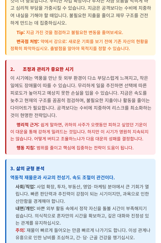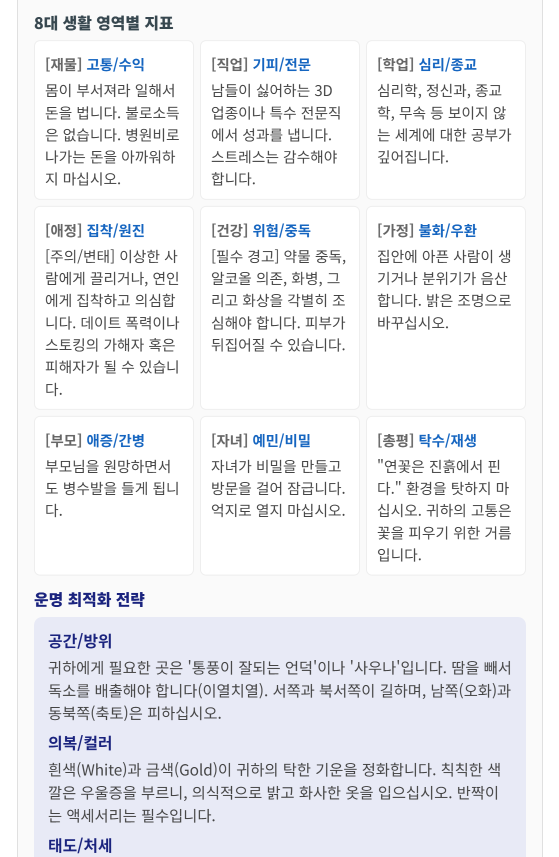 • 내 사주에 불(火)이나 나무(木)가 이미 많은 사람: 작은 불꽃에 기름을 부은 격이 되어 자칫 건강을 해치거나 주변과 마찰을 빚는 **’번아웃과 갈등’**을 겪기 쉽습니다. 반드시 열기를 식히는 처방이 필요합니다.