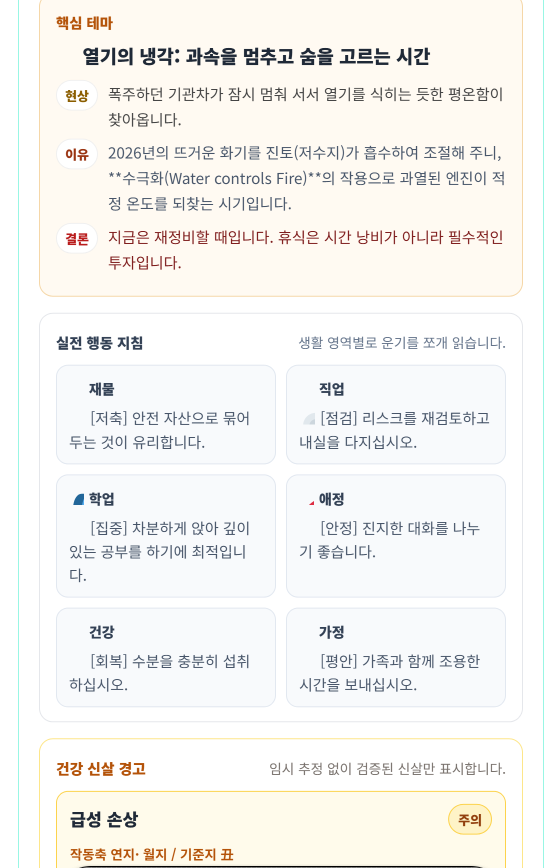 • 내 사주에 물(水)이나 흙(土)이 많은 사람: 올해 들어오는 거대한 불의 기운이 얼어붙은 땅을 녹이고 생기를 불어넣는 **’천재일우의 기회’**가 됩니다. 넘치는 에너지를 추진력 삼아 크게 도약할 수 있습니다.